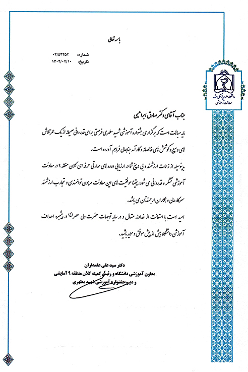 جناب آقای دکتر صادق ابراهیمی: ارزیاب فعال دوره های مهارتی و حرفه ای کلان منطقه 9